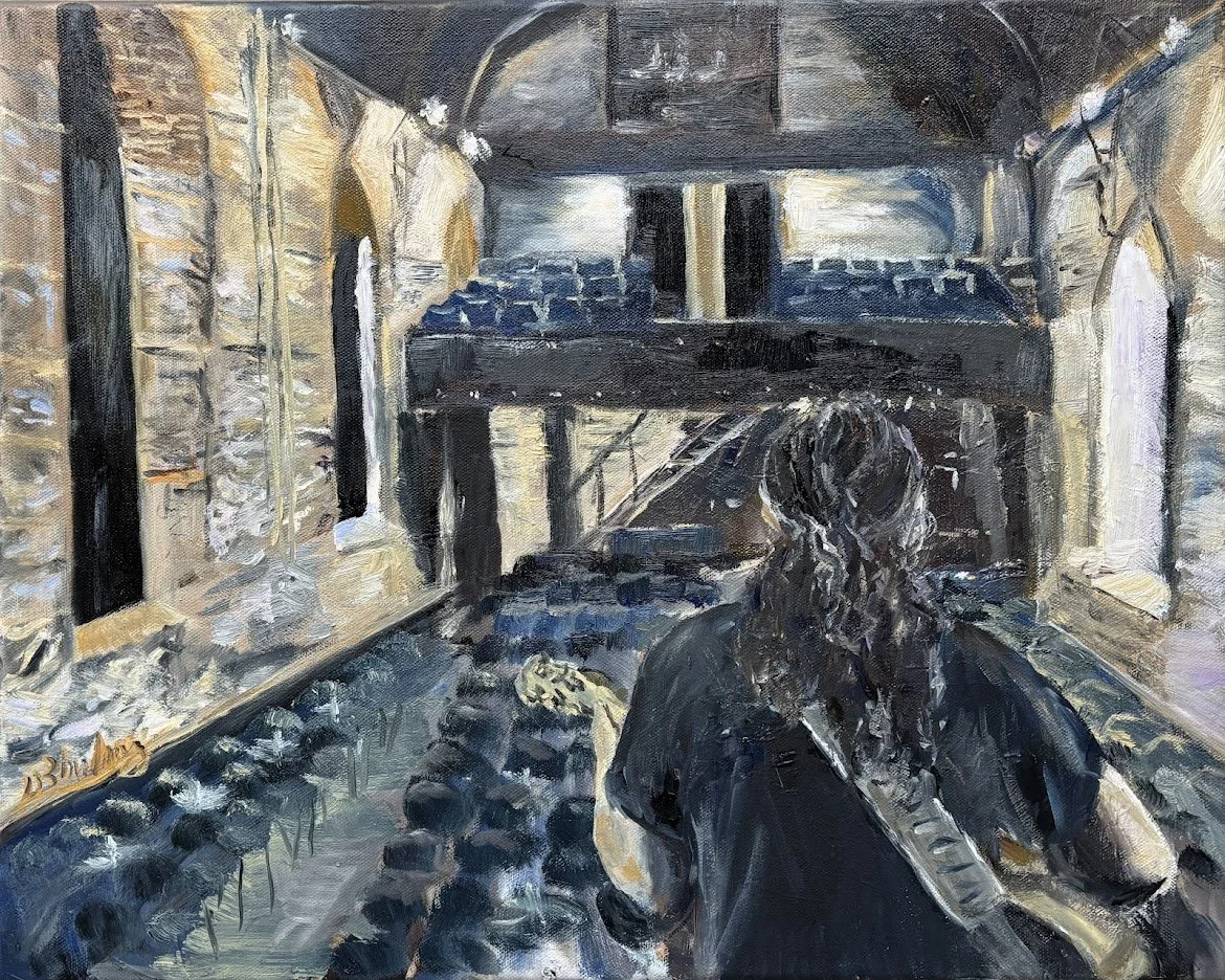 Par des coups de pinceau expressifs et une mise au point adoucie, l’artiste fusionne l’architecture sacrée avec la vulnérabilité personnelle, transformant un simple moment de répétition en une méditation poétique sur la solitude, la présence et l’art de la scène.